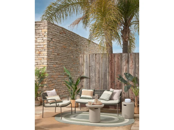 Geniet het hele jaar door van het karaktervolle tafeltje Taimi van Kave Home. Doordat het gemaakt is van cement is het bestand tegen extreme weeromstandigheden. Het heeft handvaten om het gemakkelijk te verplaatsen en beschermers om de vloer te beschermen.